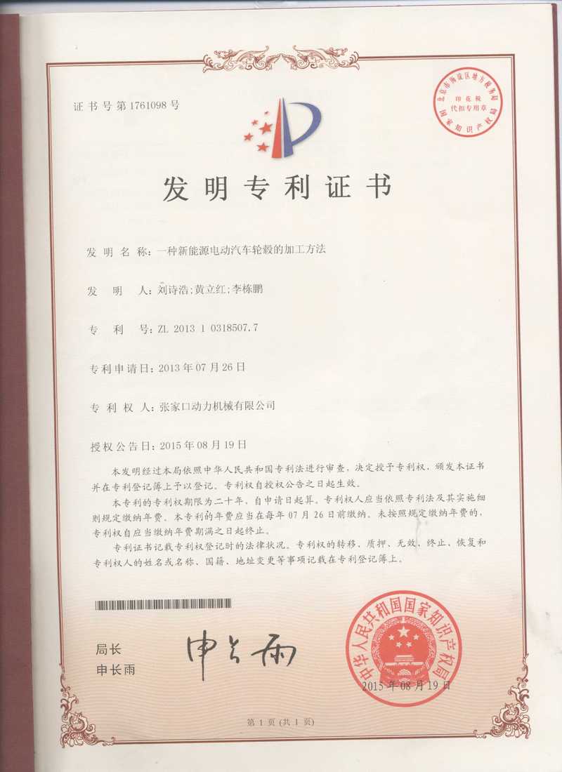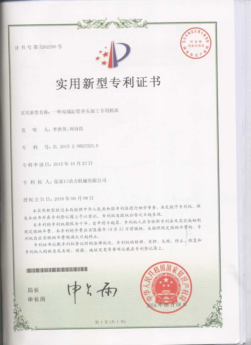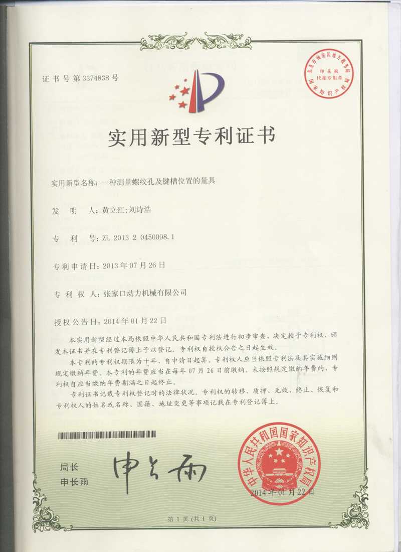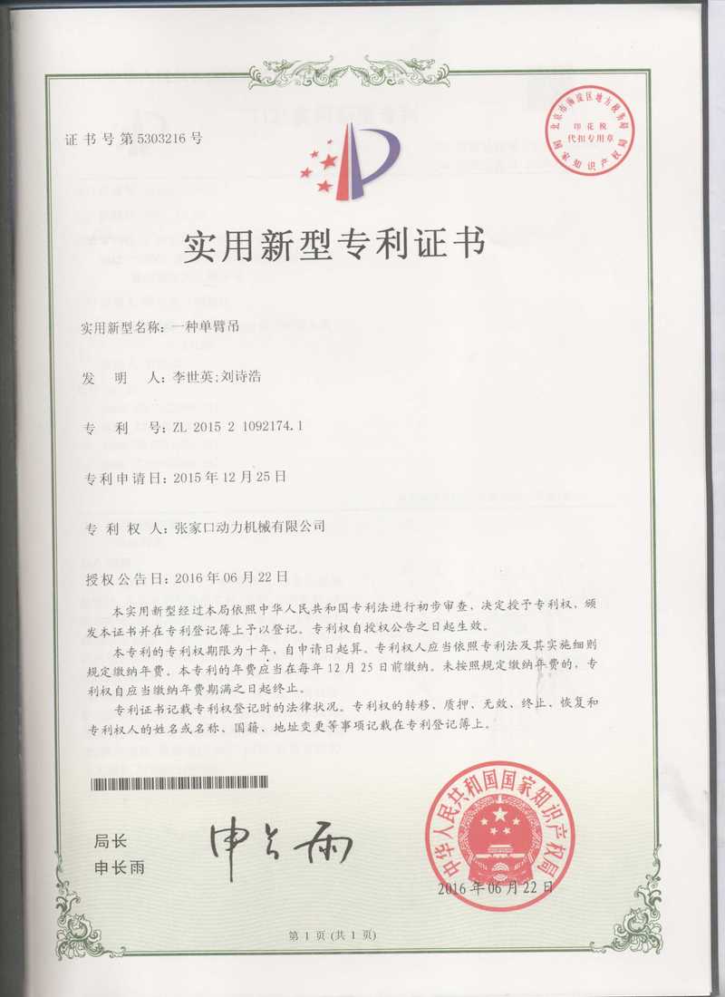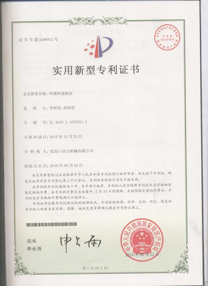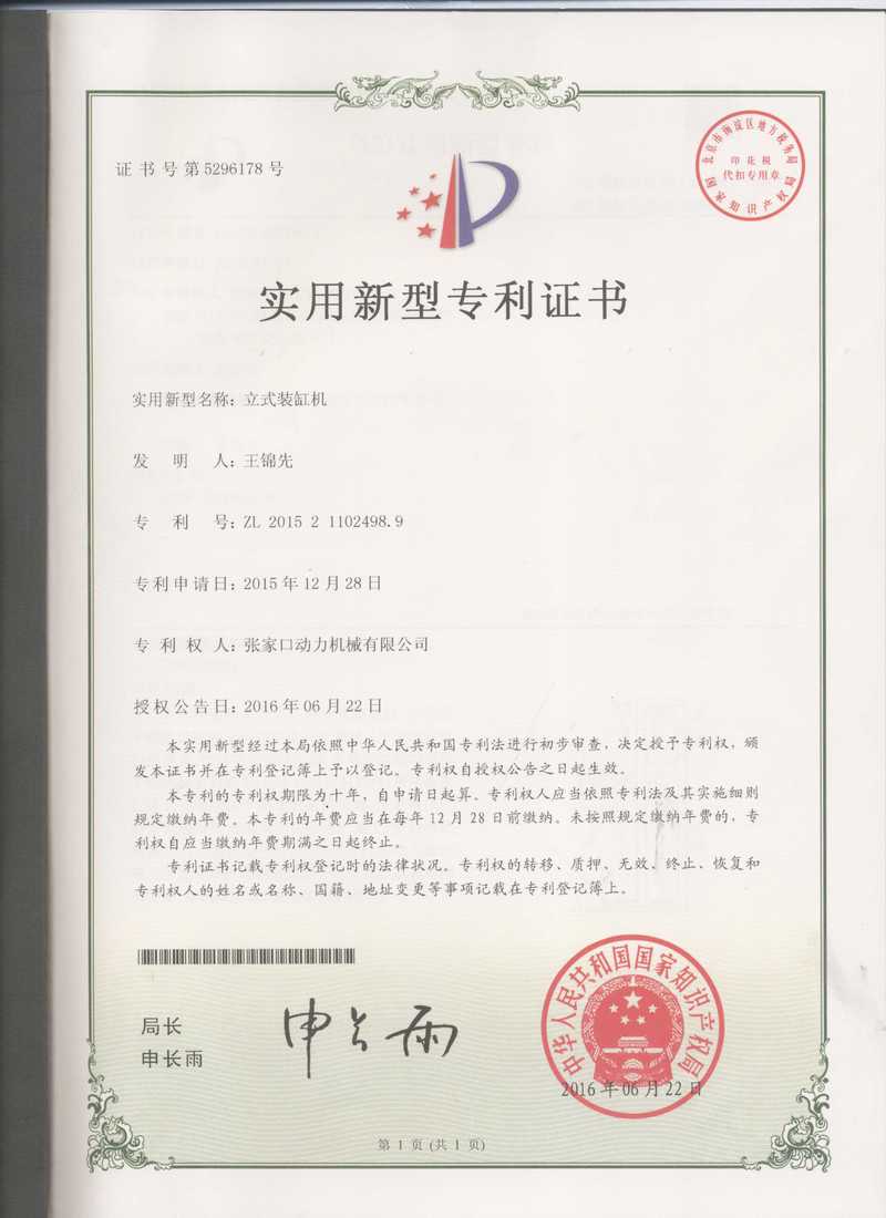 張家口動(dòng)務(wù)機(jī)械有限公司專利證書展示